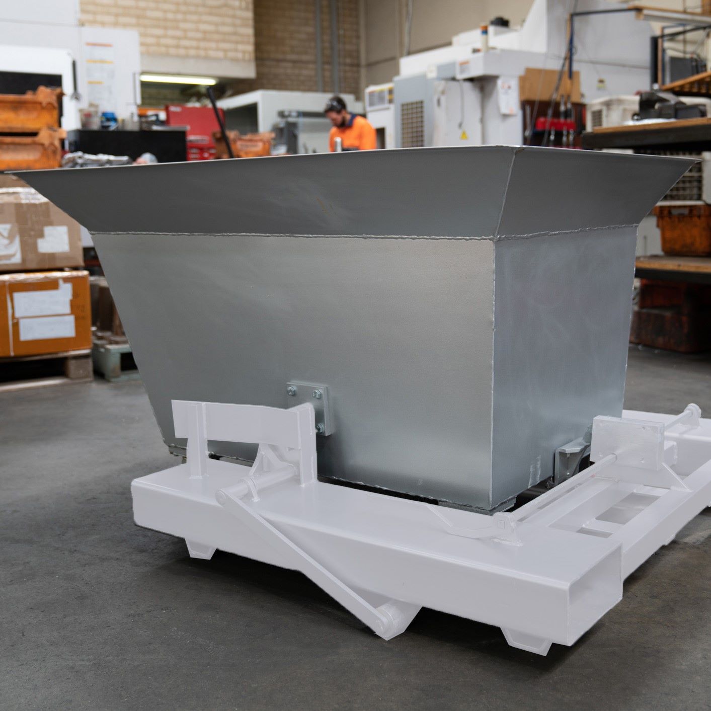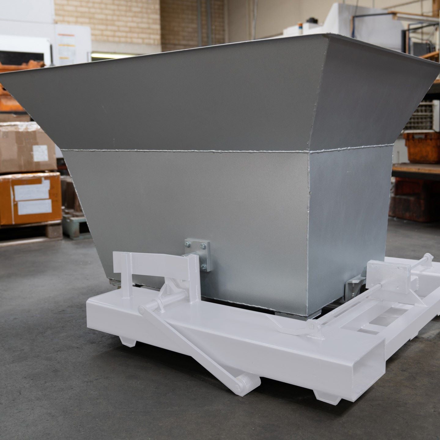 Once our swarf bins are in place, the base can be lifted by a forklift to lock the bin and base for transport. Watch and listen for the system to lock, and know that the bin is secure.